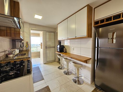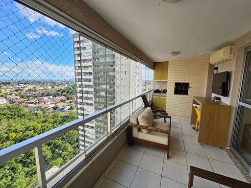 Apartamento amplo com 115 m² de área privativa, divididos em 3 quartos sendo 1 suíte e 2 demi suite, sala ampla para dois ambientes com lavabo, sacada gourmet com churrasqueira, janelas de vidros e integrada com a cozinha, banheiro social, 3 vagas de garagem sendo 2 de gaveta, posição solar (sol da manhã), andar alto (acima de 15º).